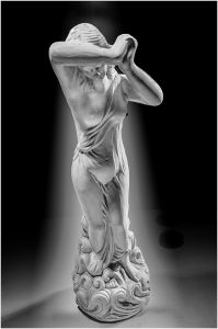 – la vue en légère plongée minimise le visage au profit d’une chevelure imposante voire un peu disgracieuse. Je dirai même que cette vue en plongée crée un éloignement avec la statue. J’aurais bien vu une prise plus basse pour aller chercher un peu plus le visage.