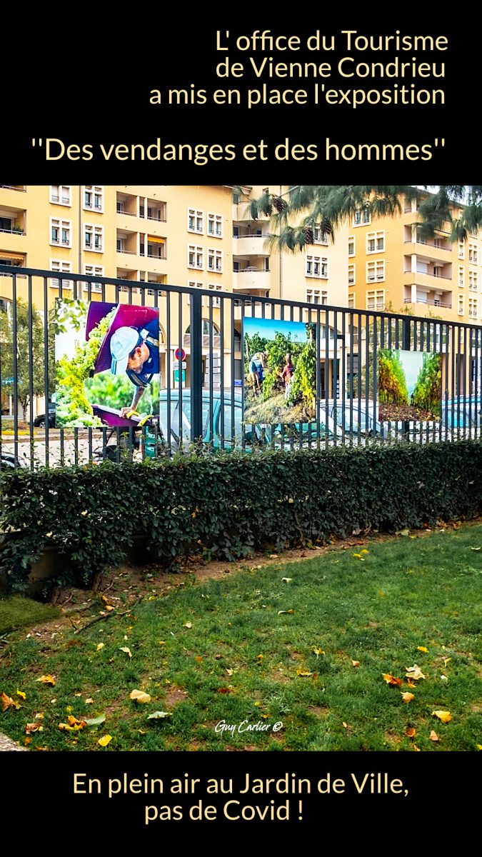 Inaugurée le jeudi 15 octobre elle reste en place jusqu’au 2 Novembre de 8h a 19 h. »Des vendanges et des Hommes » présente une vingtaine de prises de vues inédites grand format réalisées en septembre dernier, à découvrir librement en plein cœur du jardin de ville de Vienne.