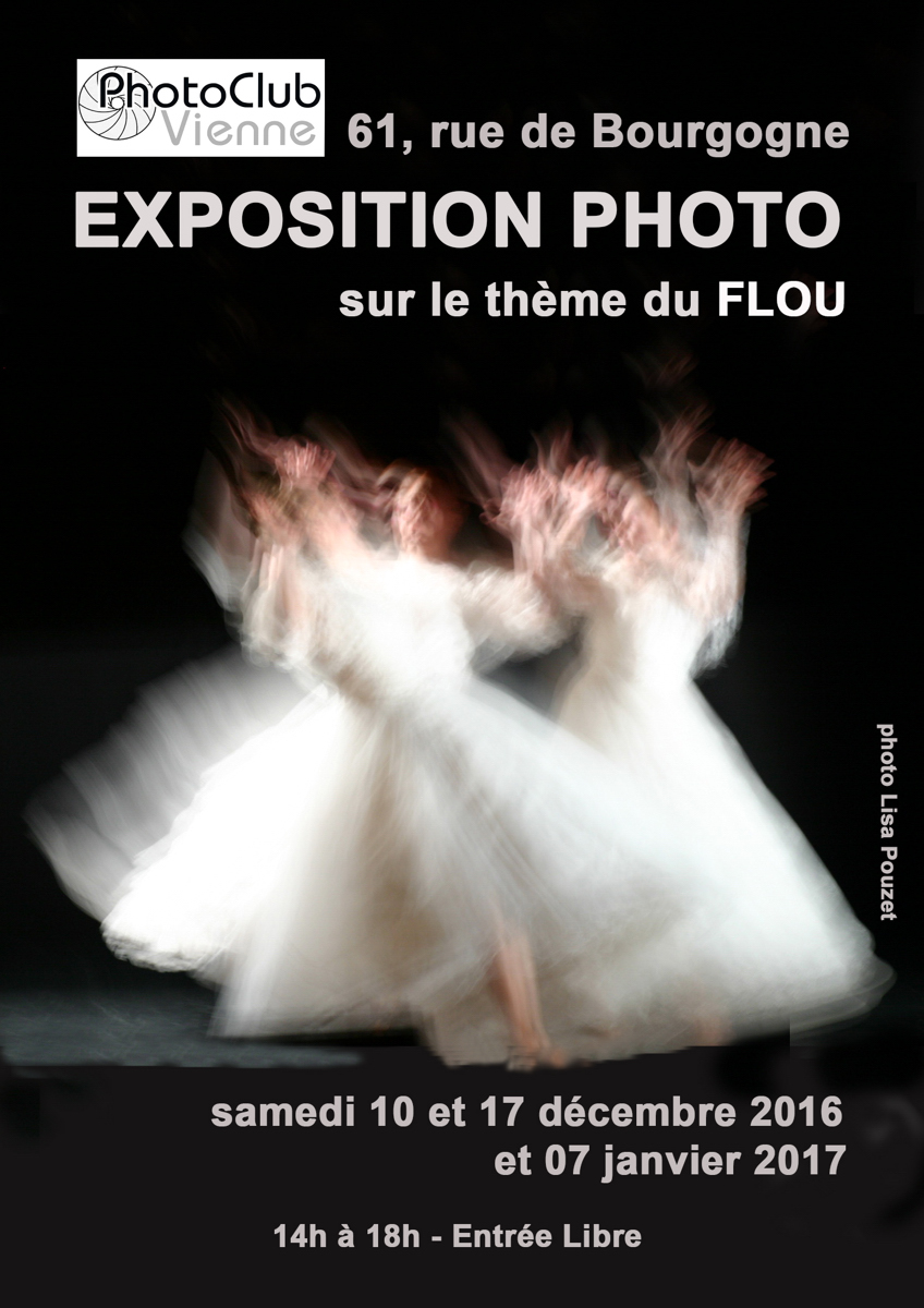 Une expo se termine, une nouvelle a commencée le samedi 10 décembre sur le thème du FLOU volontaire, elle sera encore visible les samedi 17 décembre 2016 et 07 janvier 2017 au 61 rue de Bourgogne à VIENNE.