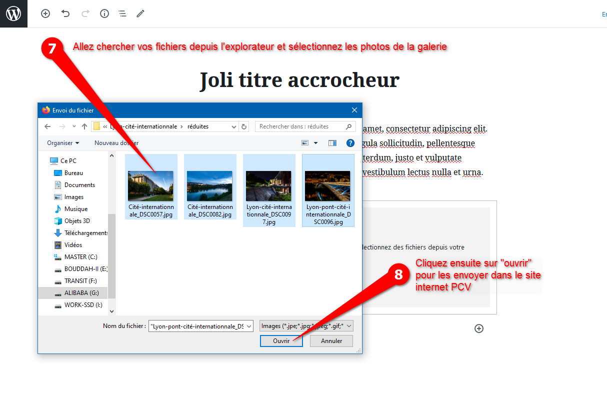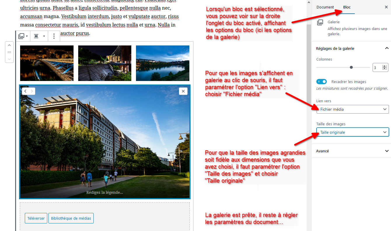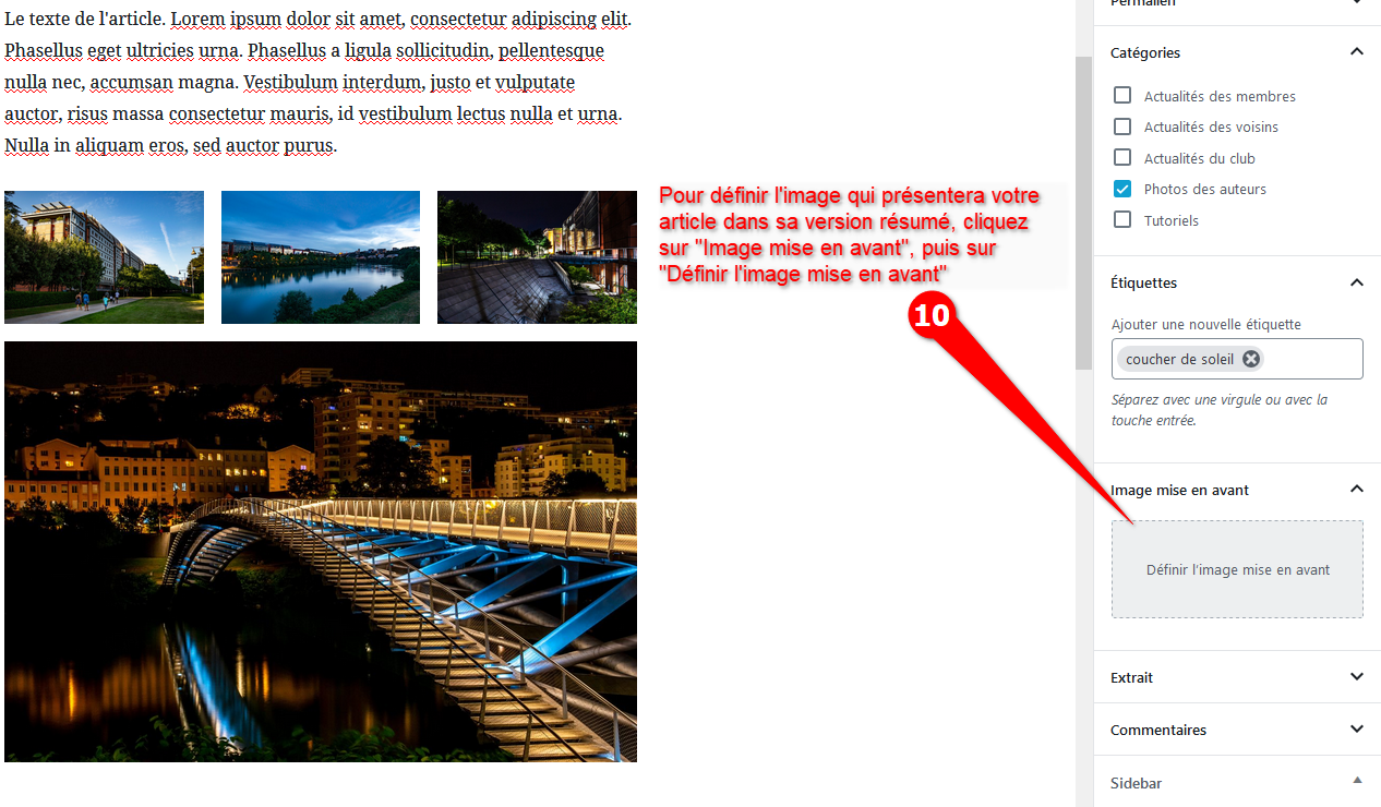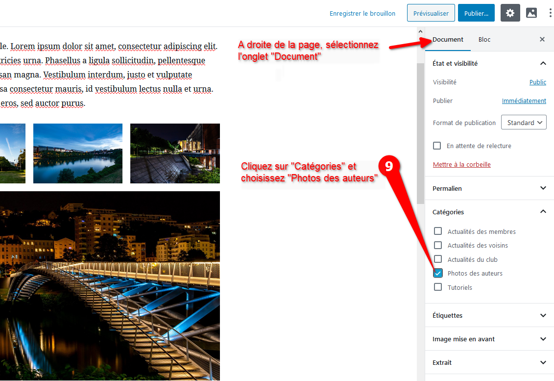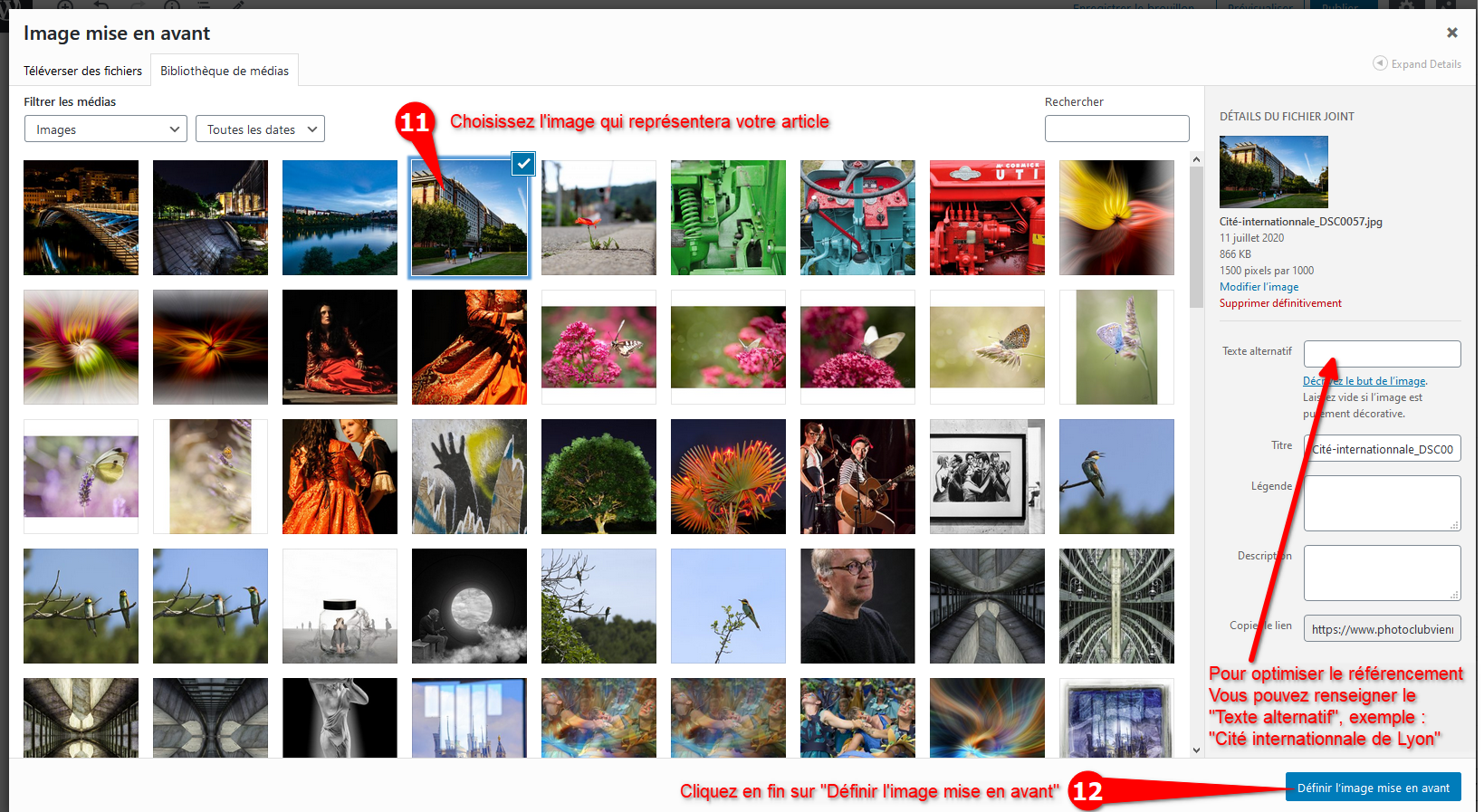 Info: Si vous ne souhaitez publier qu’une seule photo, vous n’avez qu’à renseigner « Image mise en avant » dans les propriétés du document et c’est suffisant (voir points 10, 11 et 12).